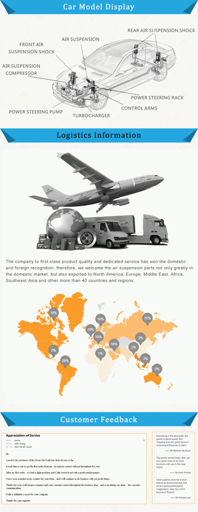 گوانگژو فنی استاد قطعات خودرو شرکت با مسئولیت محدود . یک شرکت حرفه ای است که متخصص در توسعه، تولید و صادرات قطعات تعلیق هوا مانند هوا بهار، هواپیما، کمک فنر هوا، کمپرسور هوا، پمپ فرمان پد، دنده فرمان، بازوهای کنترل، لوازم جانبی دیگر و لوازم جانبی تعلیق، به خصوص برای مرسدس بنز، BMW، آئودی، لندرور، لینکلن و فورد. ما همچنین مدل های دیگری از اجزای تعلیق هوا و مجموعه ای از چشمه های جلو و عقب وسایل نقلیه کامیون سنگین را ارائه می دهیم.